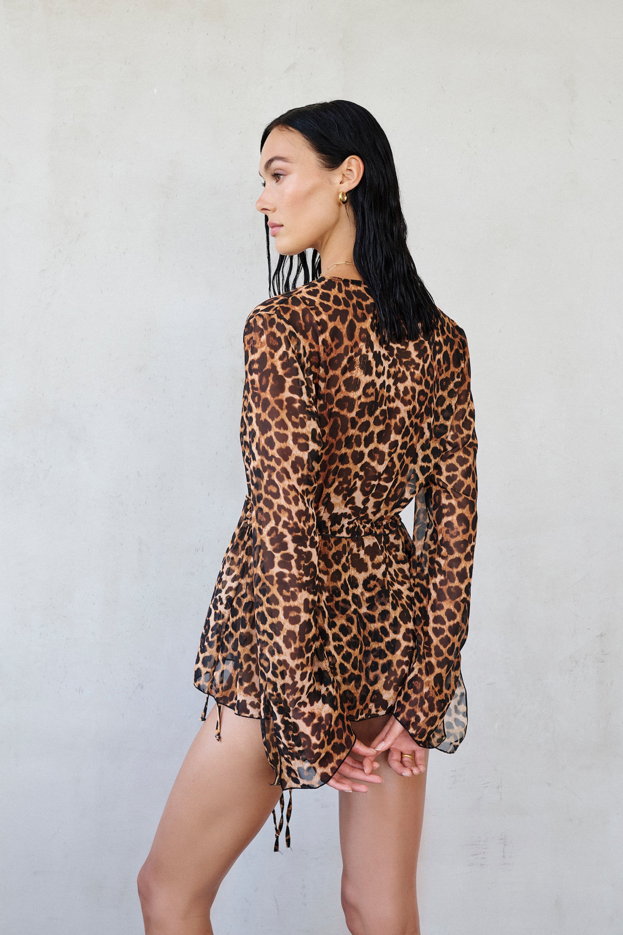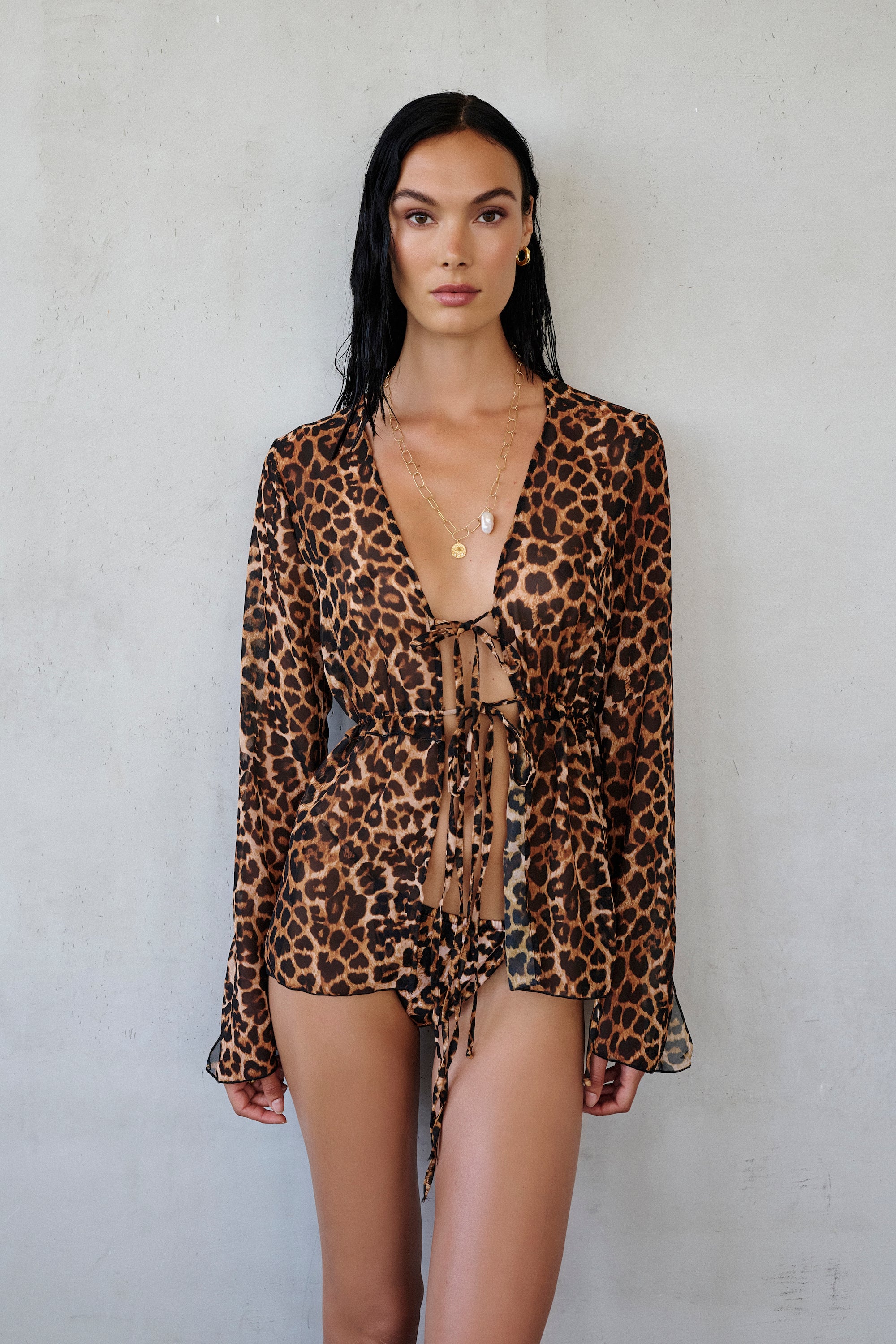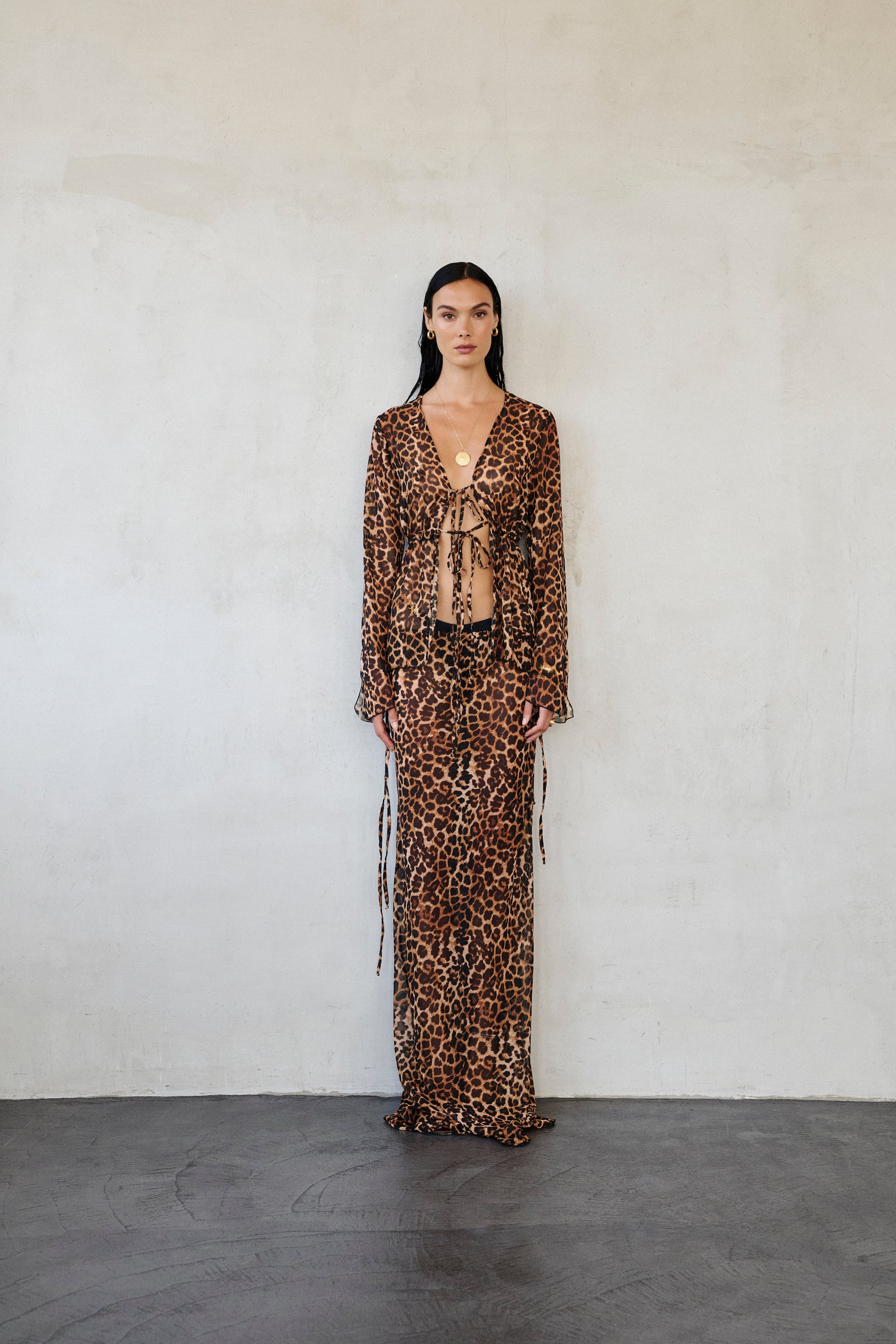 A striking two-piece set crafted from lightweight sheer mesh in bold leopard print. The top features long sleeves and adjustable front ties for versatile coverage and styling. The matching high-waisted skirt hugs the body with subtle ruching and side drawstrings that allow for customizable length. A head-turning ensemble perfect for layering over swimwear or dressing up for sunset cocktails.